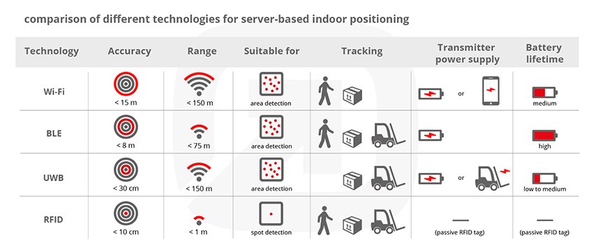 Indoor positioning systems (IPS) enable locating the position of objects or people within buildings. Since GPS is unreliable in interior spaces because there is no visual contact with the GPS satellites, an IPS (indoor positioning system) must use other positioning methods. These include, for example, the common consumer standards Wi-Fi or Bluetooth Low Energy (BLE), but also solutions based on Ultra-wideband (UWB) or passive RFID. The first and most important step in the implementation of indoor positioning systems is the selection of the indoor positioning method and technology.